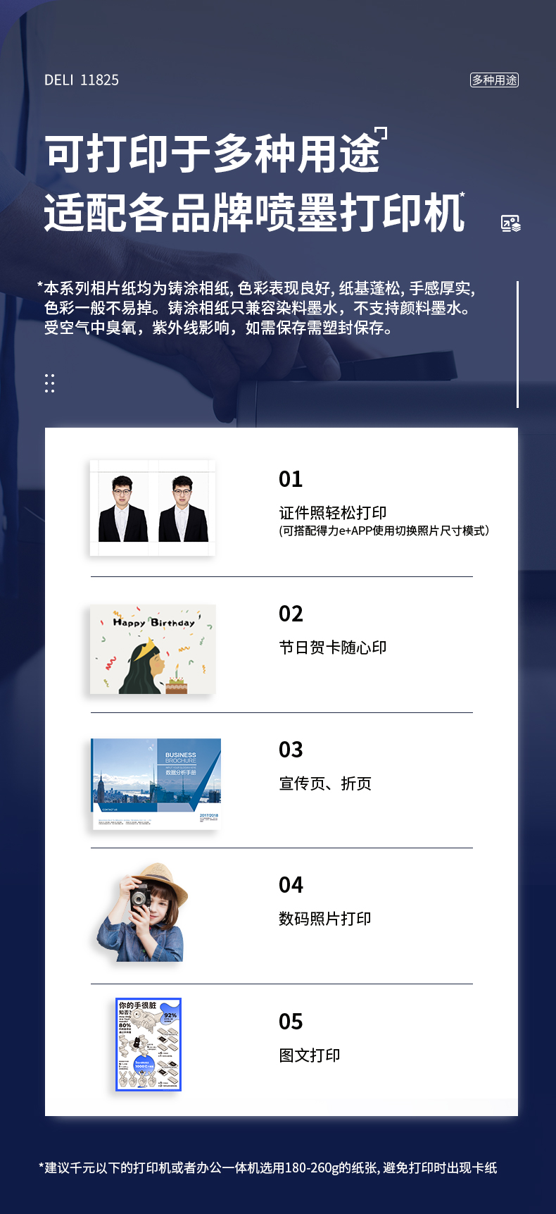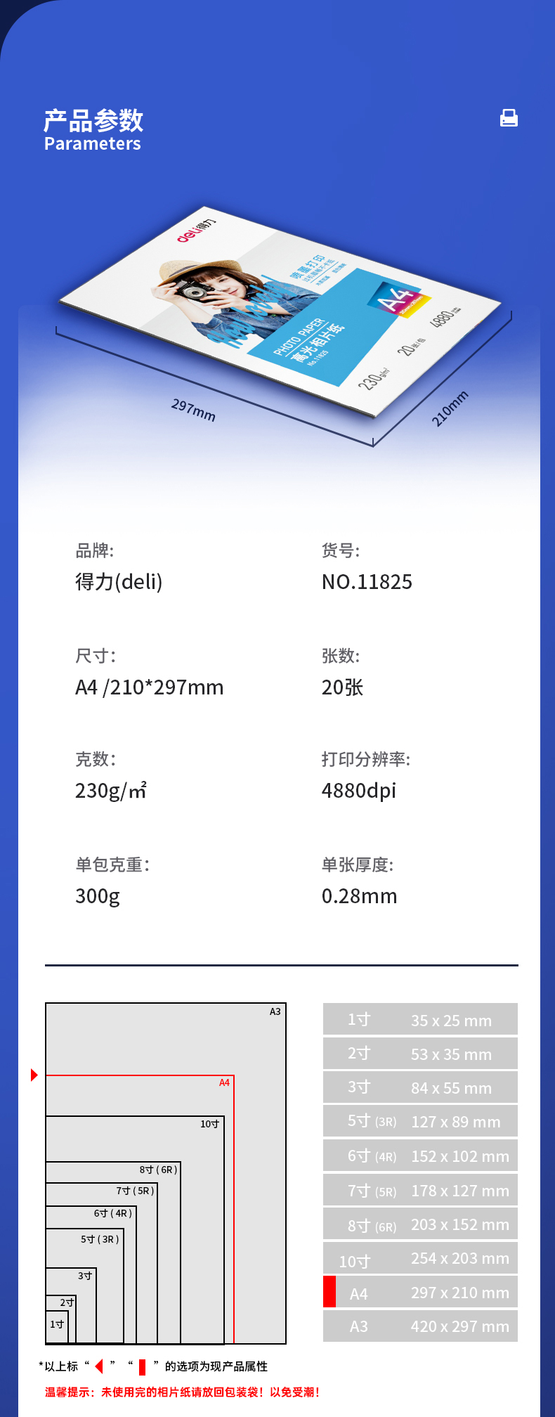 得力11825 噴墨/相片紙/卡紙 A4 230g高光面照片紙 相片打印紙 20張/包 11825
