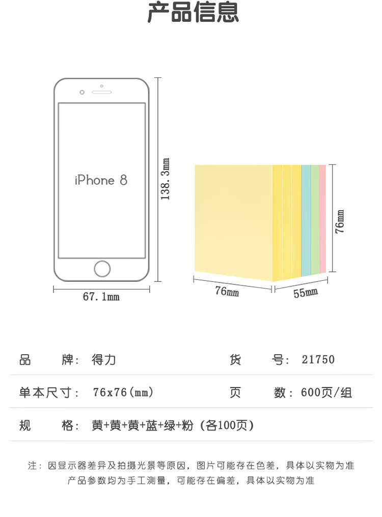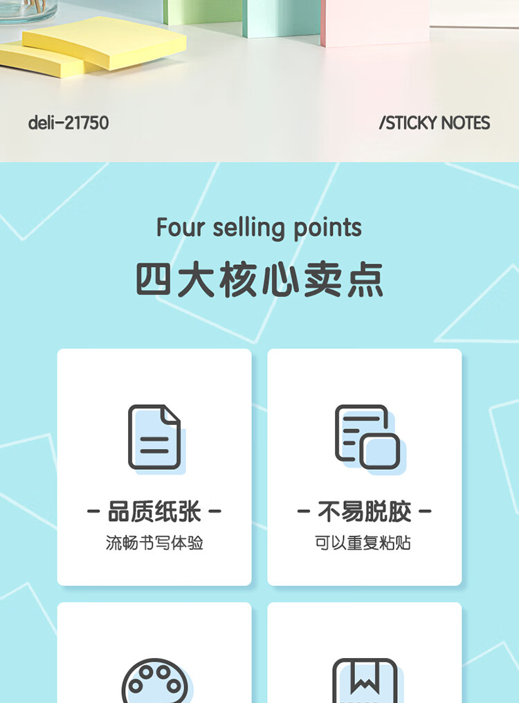 得力 deli 600頁4色簡約便簽紙便利貼 76*76mm 便簽本/ 記事貼/ 自粘留言本 辦公用品 21750