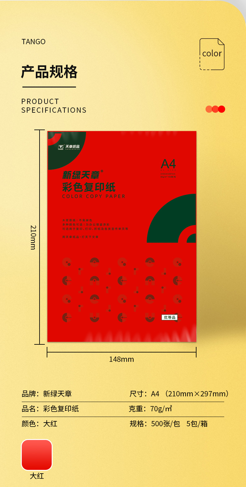 天章 TANGO P65435 復(fù)印紙 500張*5包 a4大紅色打印紙 70g2500頁彩色復(fù)印紙
