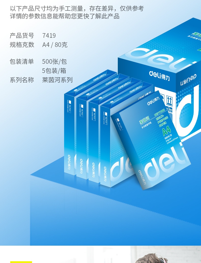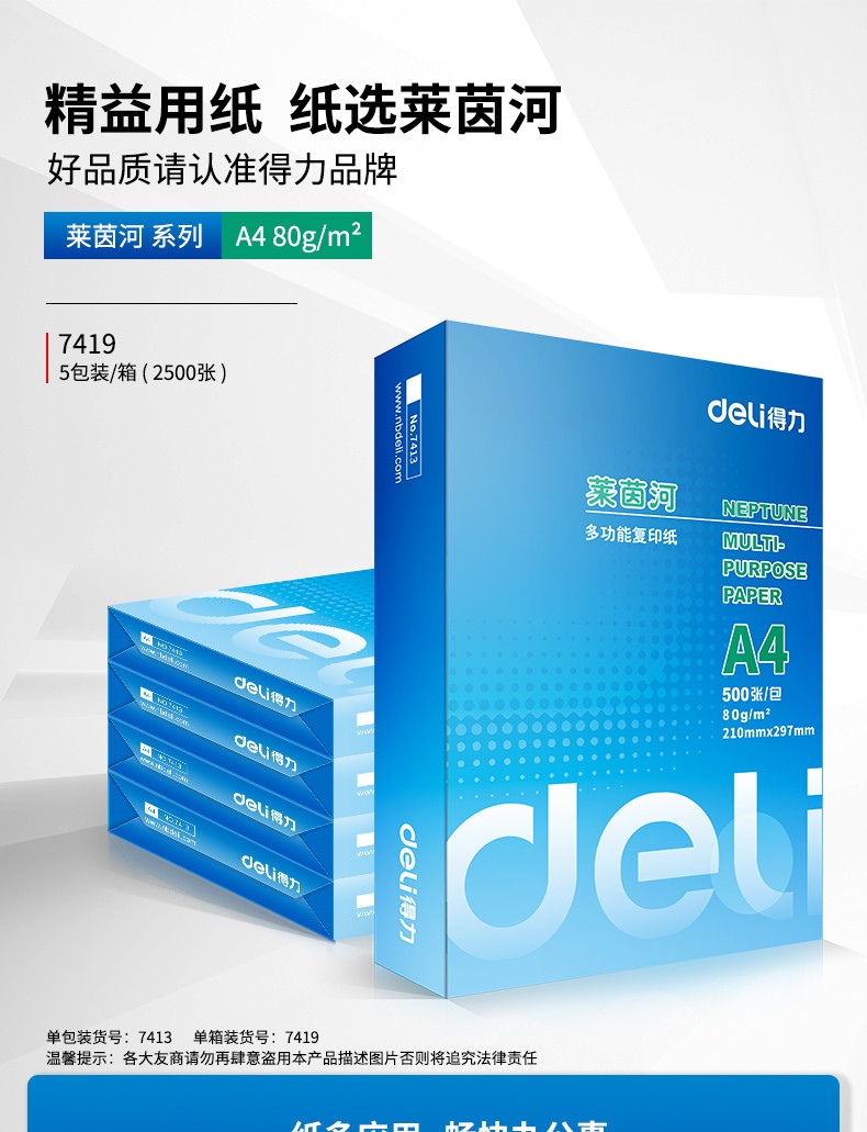 得力 7419 復(fù)印紙 萊茵河復(fù)印紙(A4-80g-5包)(2500張)電腦打印紙復(fù)印紙