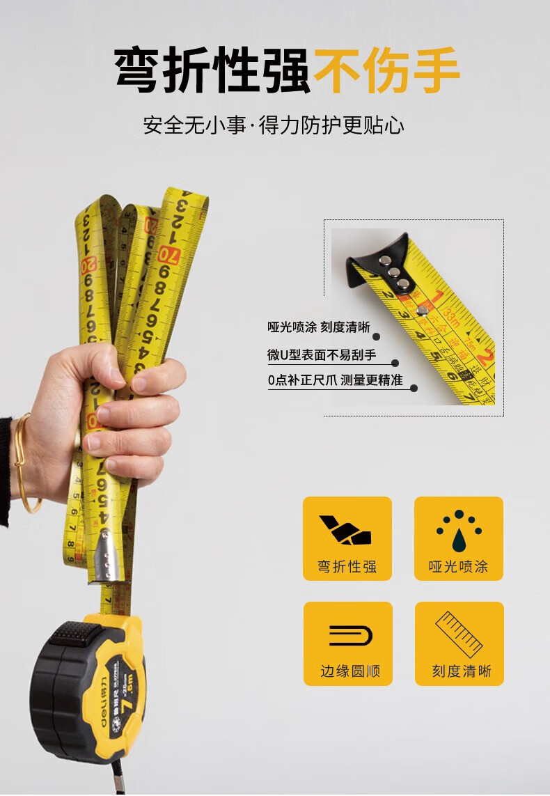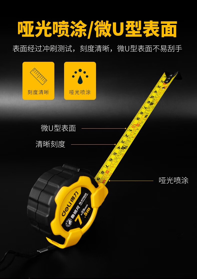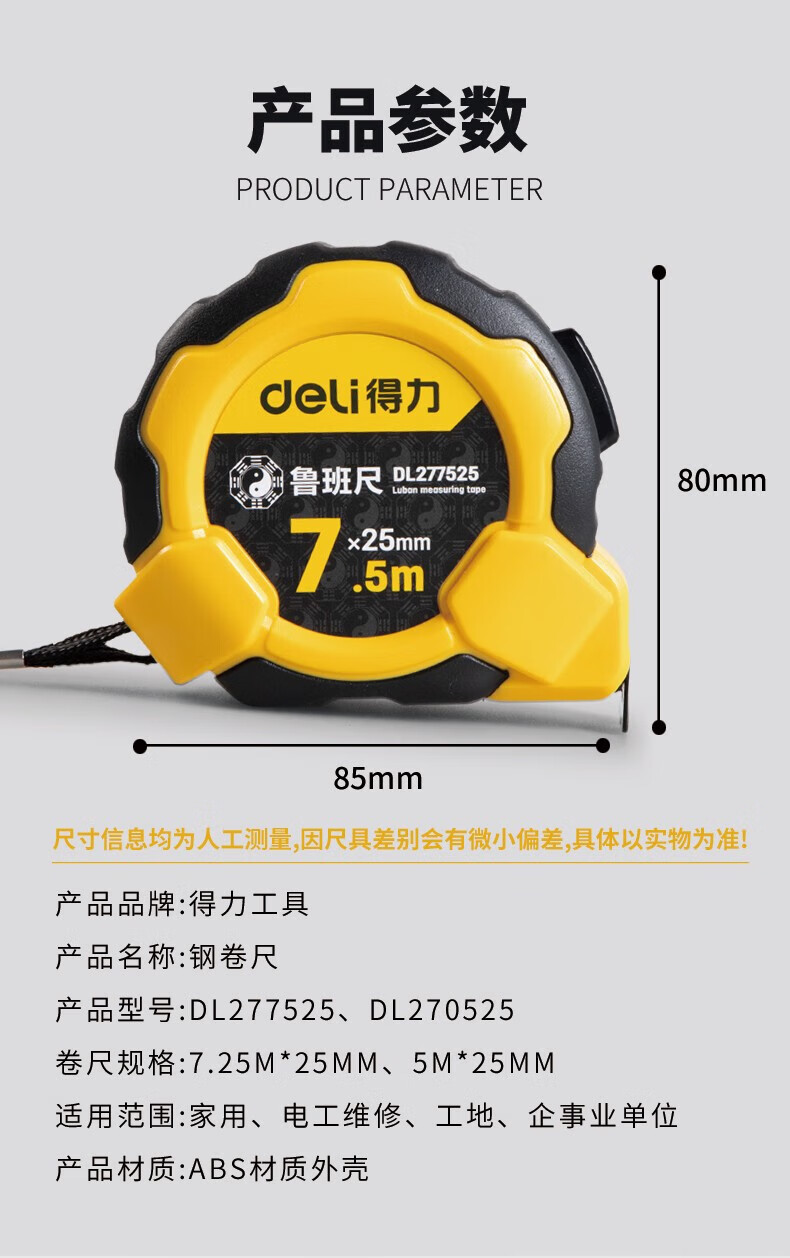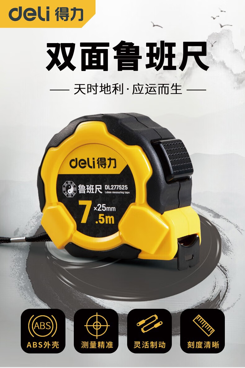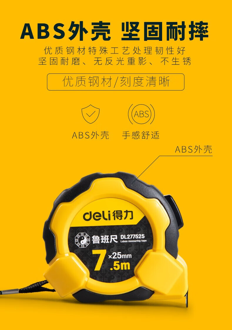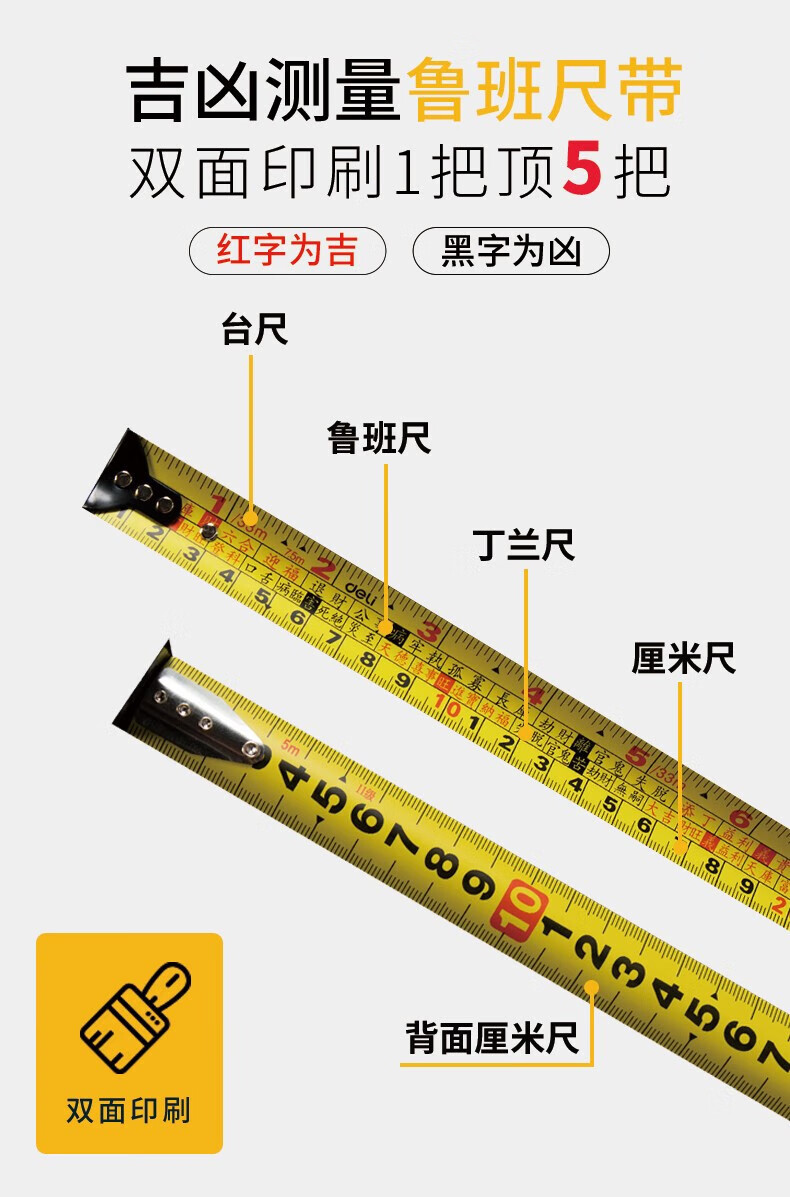得力(deli)DL270525 各種尺 魯班尺風(fēng)水尺正宗門尺精密丁蘭尺高精度鋼卷尺5米盒尺子 耐摔包膠款風(fēng)水測吉兇10mx25mm