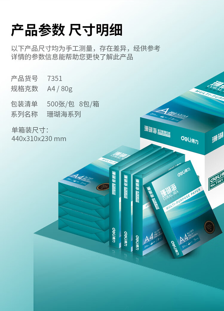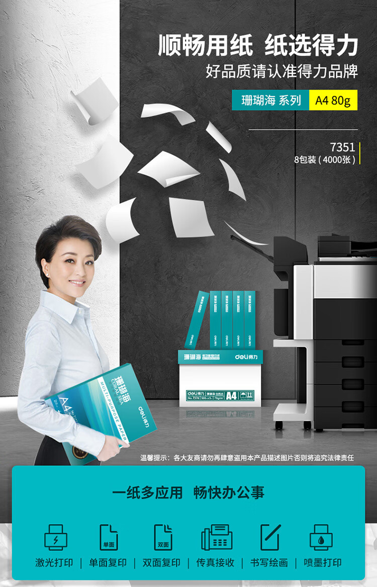 得力 A3 70g 復(fù)印紙 珊瑚海 原裝