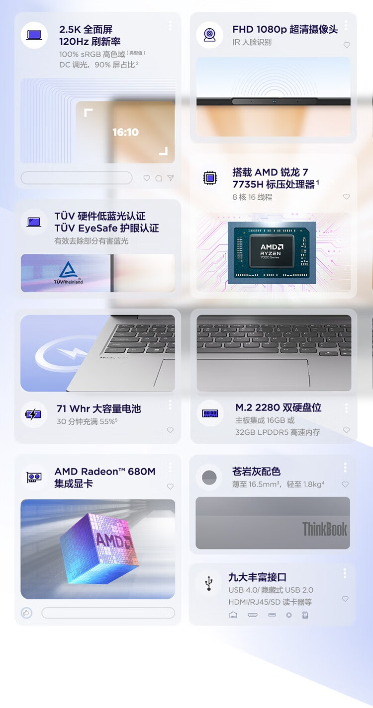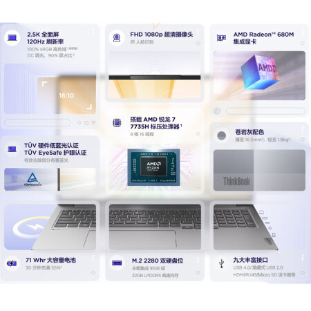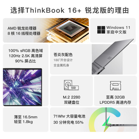 聯(lián)想 ThinkBook便攜式計(jì)算機(jī) 16+ 2023款 AMD銳龍標(biāo)壓聯(lián)想筆記本電腦 16英寸標(biāo)壓輕薄本R7-7735H 32G 512G SSD 2.5K 120Hz